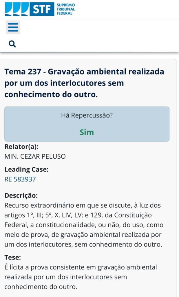 O Supremo Tribunal Federal (STF) já consolidou o entendimento de que é lícita a prova obtida por meio de gravação ambiental realizada por um dos