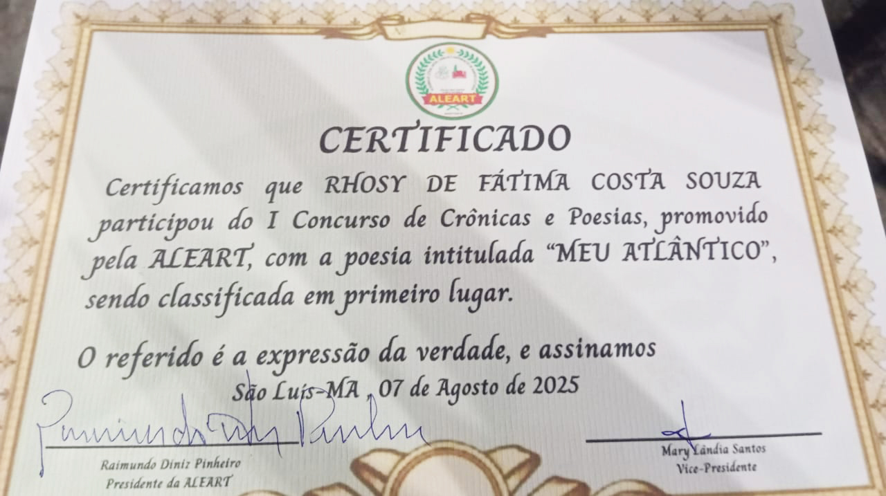 A estudante Rhozy de Fátima Costa Souza, da Unidade Municipal Integral Prof. Paulo Fernandes Salgado, da rede de ensino de Viana (MA), foi a grande vencedora do Concurso de Crônicas e Poesias promovido pela Academia de Letras, Artes, Ciências e Saberes Culturais da Área Itaqui-Bacanga – ALEART (São Luís).