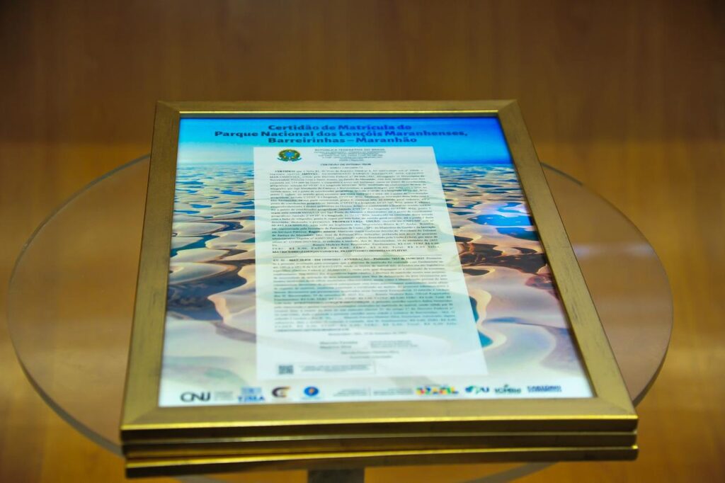O presidente do Tribunal de Justiça do Maranhão, desembargador Froz Sobrinho, e a presidente da Assembleia Legislativa do Maranhão, deputada Iracema Vale (PSB), entregaram oficialmente, nesta sexta-feira (10), o Registro Imobiliário do Parque Nacional dos Lençóis Maranhenses.