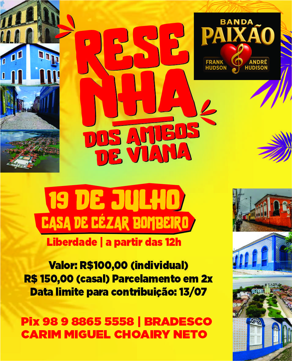 A “Resenha dos Amigos de Viana” acontece na sua acolhedora residência, no bairro da Liberdade, a partir das 13h, com animação musical da Banda Paixão (Frank Hudison e André Hudson), com cerveja gelada e um cardápio bem ao gosto dos baixadeiros.