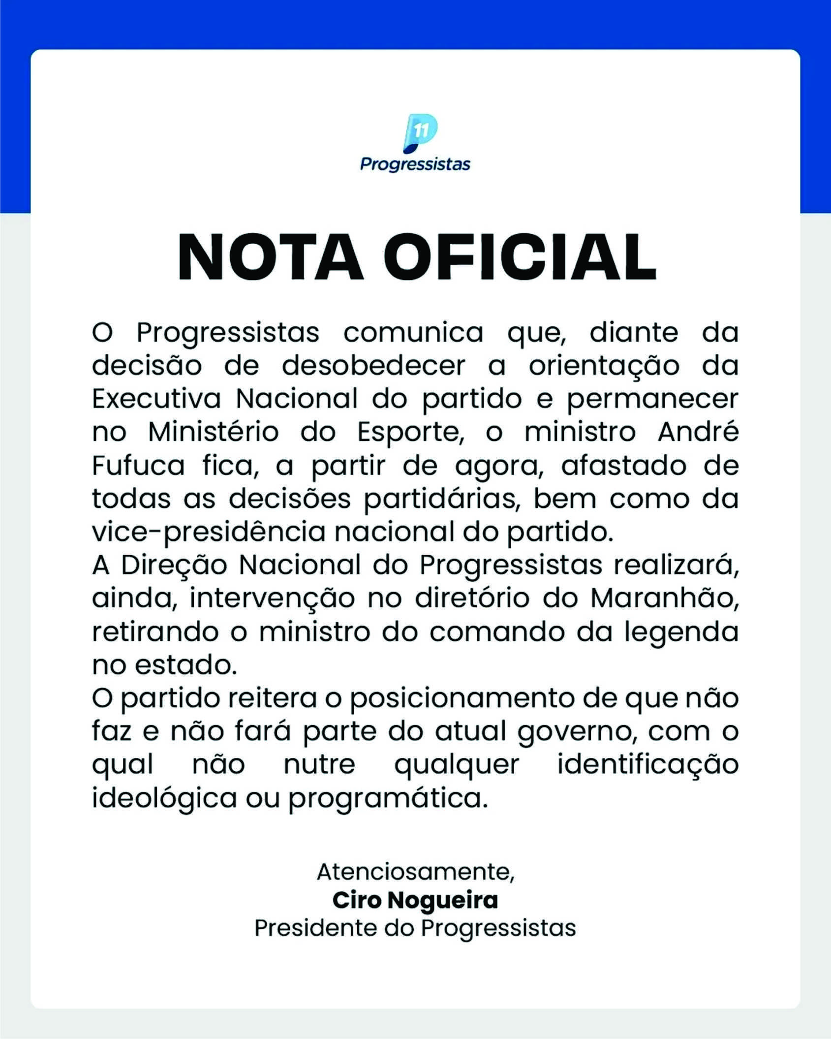 “Fica afastado de todas as decisões partidárias, bem como da vice-presidência nacional do partido”, diz nota assinada por Ciro Nogueira. O presidente nacional do PP afirmou também que fará uma “intervenção” no diretório do Maranhão para retirar o ministro do comando da legenda no estado.