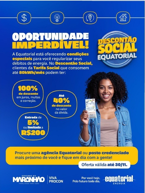 A Equatorial Maranhão acaba de lançar o programa “Descontão Social” , uma iniciativa inédita e imperdível para os clientes cadastrados na Tarifa Social de Energia Elétrica – Baixa Renda , com consumo de até 80kWh, que possuem faturas de energia em atraso. Até o dia 30 de novembro de 2025 , será possível negociar débitos com condições especiais que garantem mais dignidade e tranquilidade para milhares de famílias.