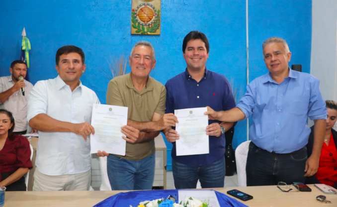 Fufuca e Carrinho Cidreira, no gabinete da Prefeitura de Viana, ao lado secretário nacional de Esporte Paulo Henrique, assinaram o instrumento de formalização referente a construção de quadra poliesportiva e instrumento de formalização referente ao Copão do Povo, maior competição esportiva do futebol amador na região.