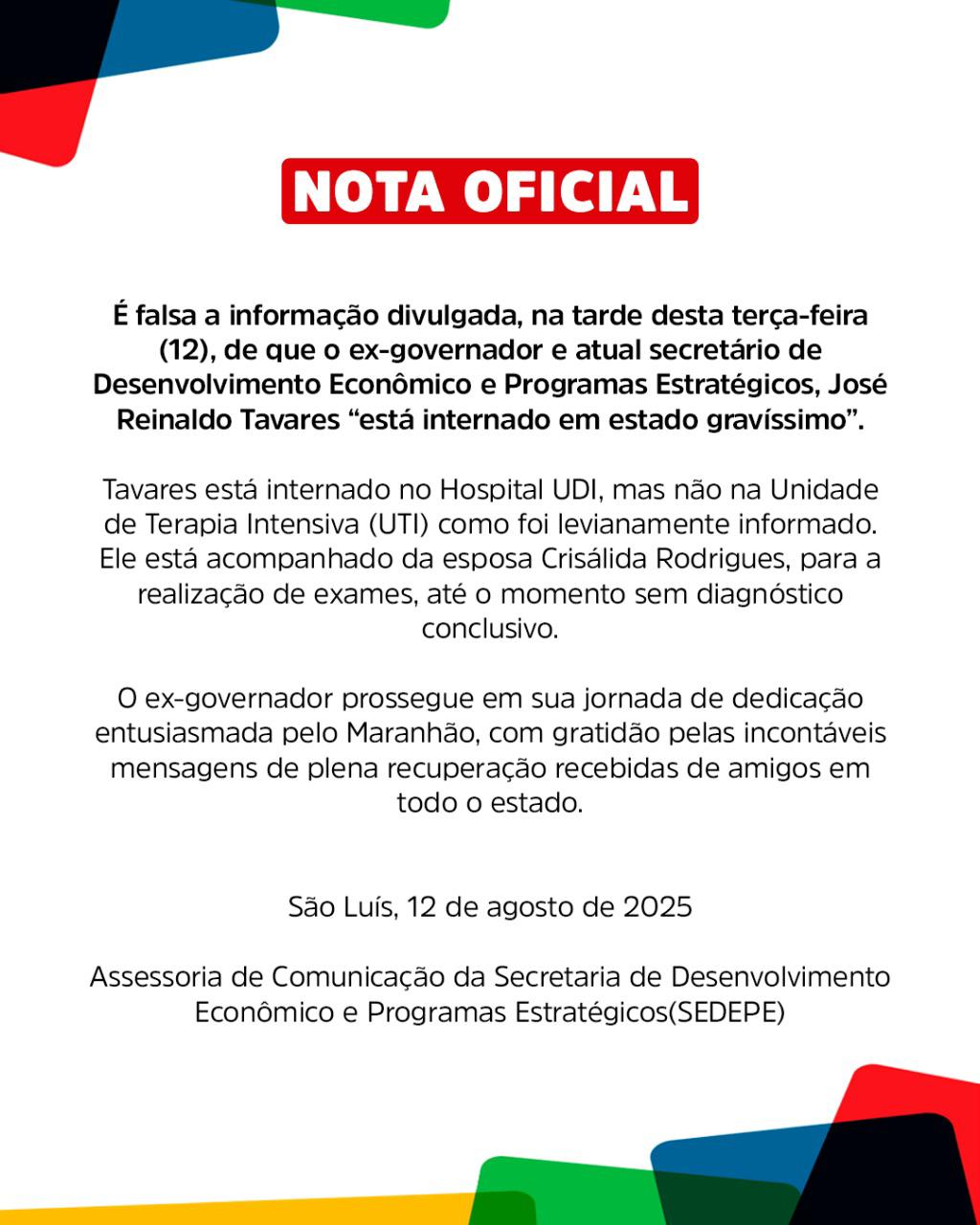 É falsa a informação que circulou, na tarde desta quarta-feira (12), sobre o estado de saúde do ex-governador e atual secretário de Desenvolvimento Econômico e Programas Estratégicos, José Reinaldo Tavares.