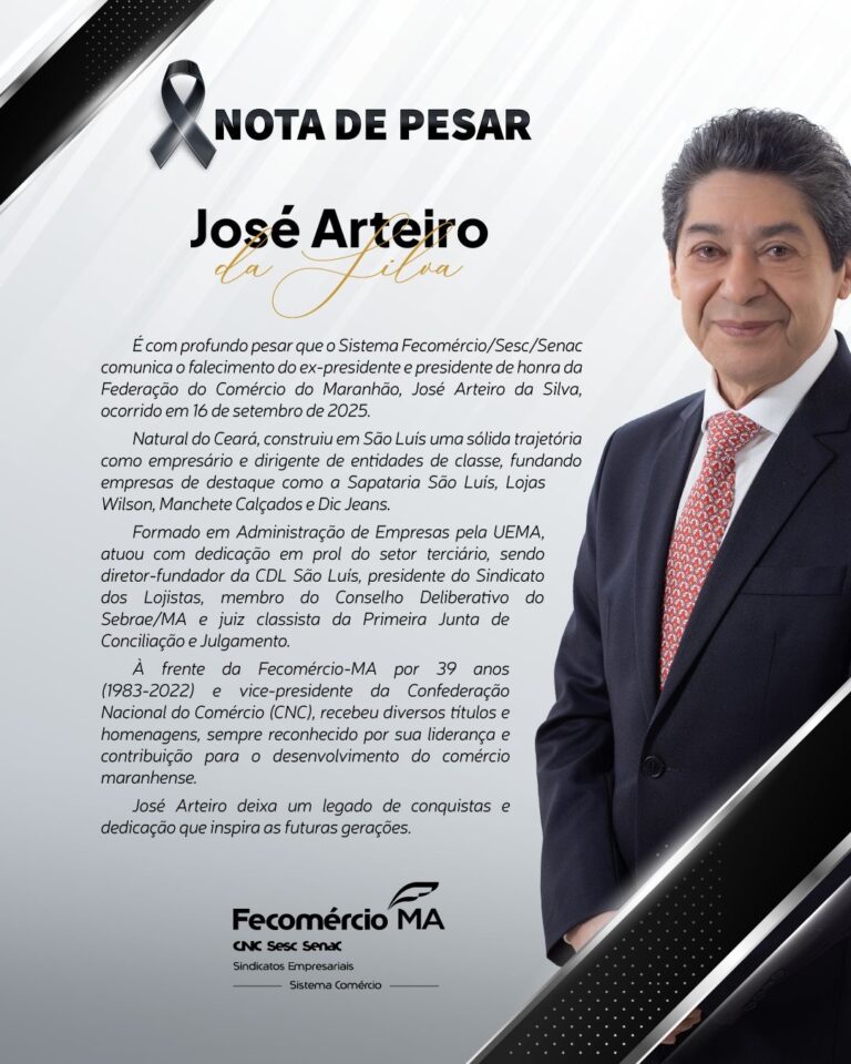 Com profundo pesar, o Sistema Fecomércio/Sesc/Senac comunica o falecimento do ex-presidente e presidente de honra da Fecomércio-MA, José Arteiro da Silva, nesta terça-feira (16), que esteve à frente da instituição por 39 anos (1983–2022).