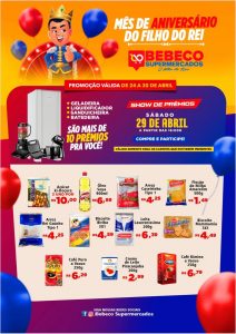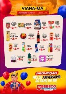 Viana – O BEBECO SUPERMERCADOS – O Filho do Rei, completa mais um aniversário, neste sábado, 29, e faz uma grande festa em frente à loja da Citel, com ofertas imperdíveis e sorteio de prêmios para seus clientes.