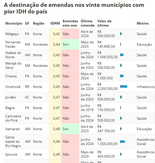 Dos R$ 28 bilhões de emendas repassadas entre junho de 2024 e maio de 2025 no país, as cinco cidades beneficiadas no ranking das 20 com piores IDH receberam cerca de R$ 20 milhões, o equivalente a apenas 0,09% no total.